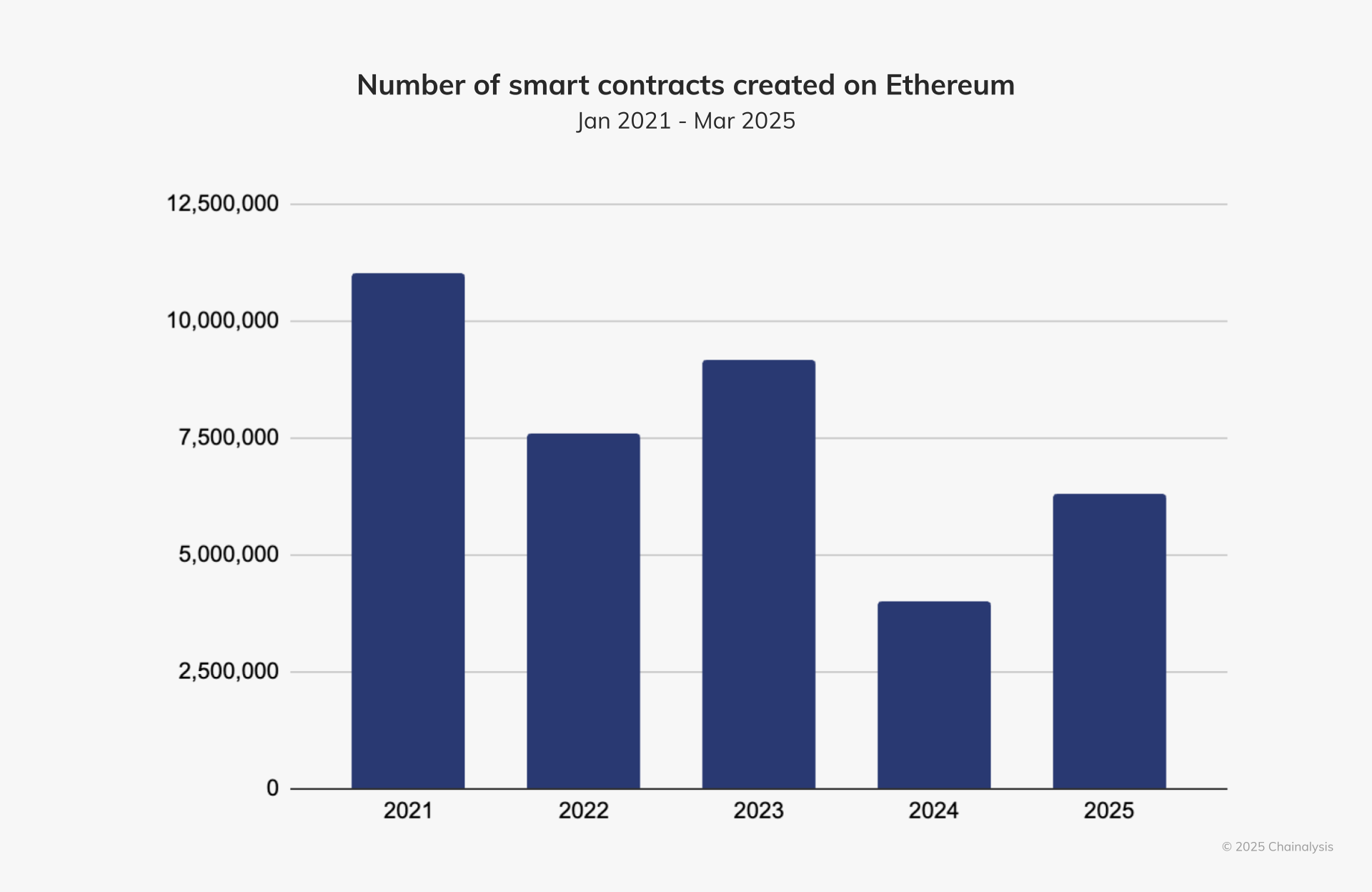 • Nearly 6.2 million new smart contracts were created in Q1 2025, surpassing the total amount created in 2024.