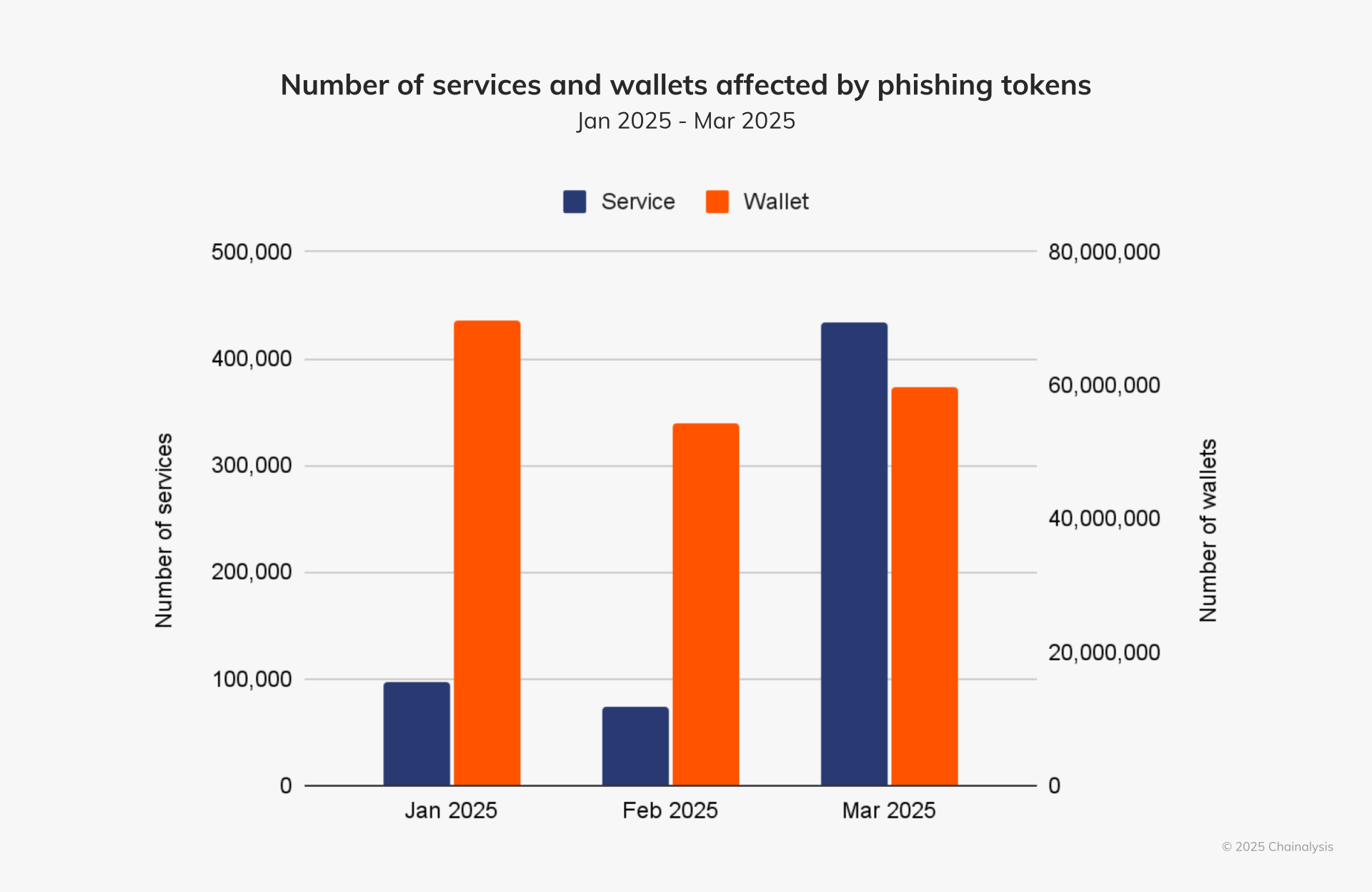 Given the rise in phishing attacks, it’s crucial to dig deeper into the above topline figures to understand just how much of the malicious activity can be traced back to phishing schemes specifically. Between January and March 2025, approximately 18,000 phishing tokens were created. Each month, phishing tokens impact more than 50 million wallets; in March 2025 alone, 400,000 services were affected.
