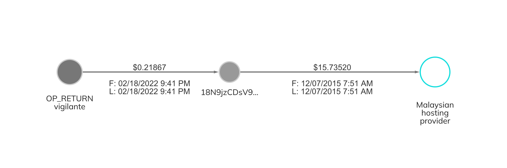 The third address appears to have been used as part of a Russian disinformation campaign. In the leadup to the 2016 U.S. Presidential Election, Russia’s GRU covertly set up the website DCLeaks.com, and used it to publish hacked materials relating to U.S. political figures. The DOJ indictment against Russian intelligence officers involved in the disinformation campaign states that agents paid in Bitcoin to lease the DCLeaks.com server from a Malaysian web hosting provider. The address used to lease that server — 18N9jzCDsV9ekiLW8jJSA1rXDXw1Yx4hDh — was also tagged by our OP_RETURN vigilante as belonging to the GRU.