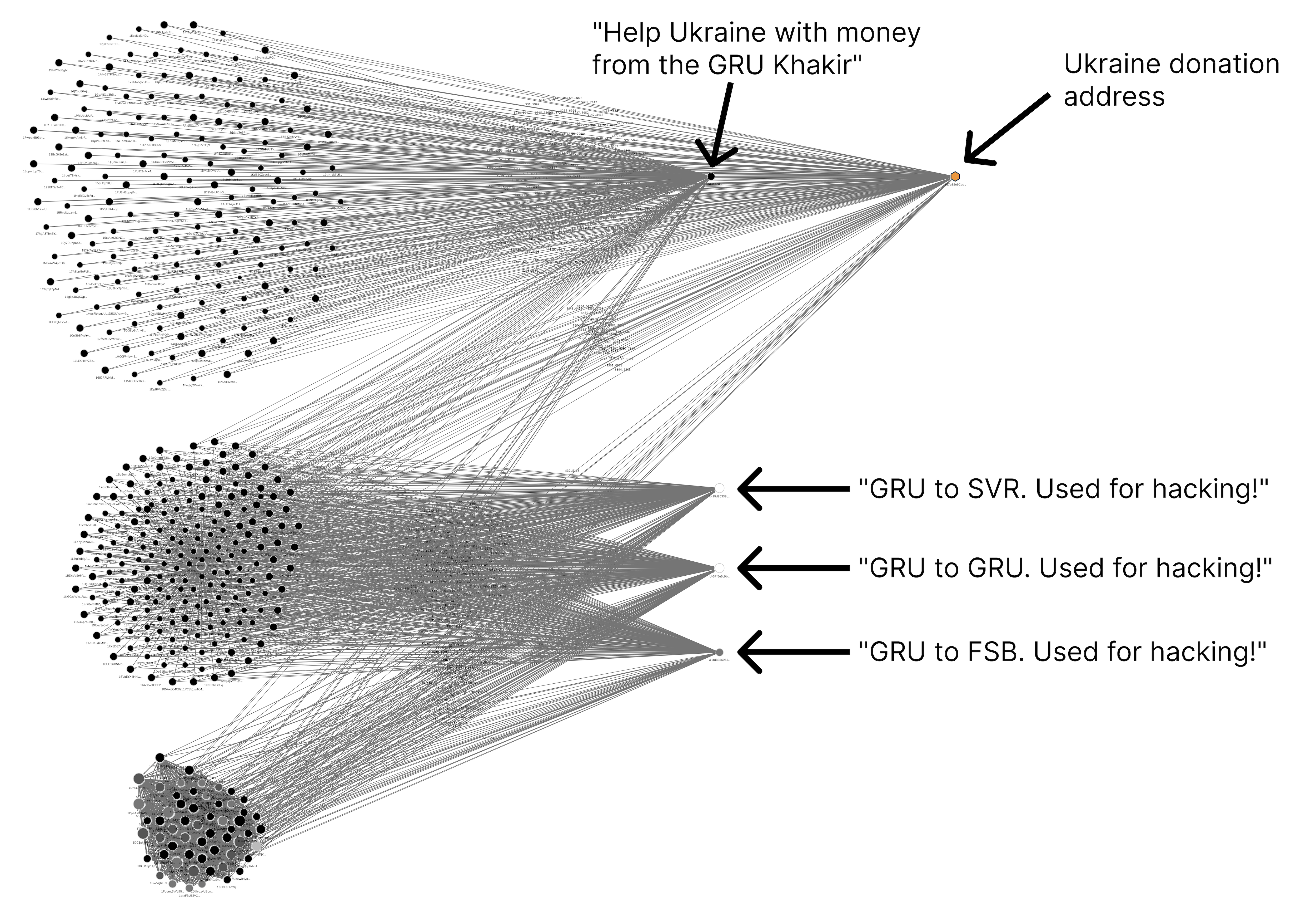 Each message claims the address in question was used in hacking operations by one of three Russian agencies: the Foreign Military Intelligence Agency (GRU), Foreign Intelligence Service (SVR), and Federal Security Service (FSB). To make things even more interesting, most of the OP_RETURN messages originated from addresses that the OP_RETURN vigilante also said belong to the Russian government in other OP_RETURN messages. Assuming the vigilante’s accusations are true, that would mean this individual accessed the private keys of Russian-controlled addresses, either through hacking or collaboration with an insider. In a series of transactions taking place in April 2022 — a few months after the others, and over a month into the invasion — the OP_RETURN vigilante sent funds held by what they claim to be a Russian-controlled address to a Ukrainian aid donation address, as indicated by the last of the four OP_RETURN messages — we can see that donation address in the upper right-hand corner of the Reactor graph above.