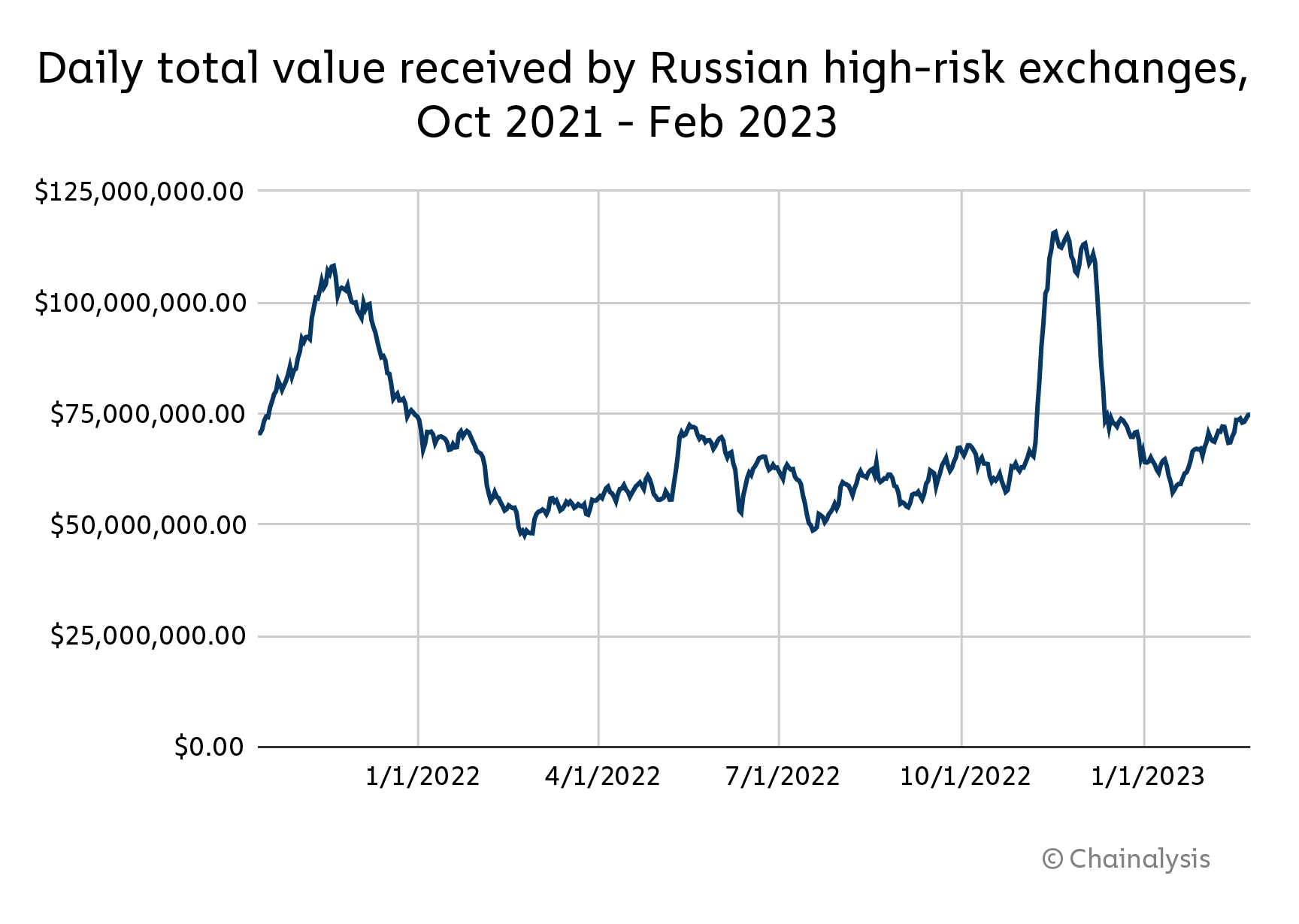 One way to estimate smaller-scale potential sanctions evasion is to look at inflows to high-risk exchanges disproportionately catering to Russia-based users.