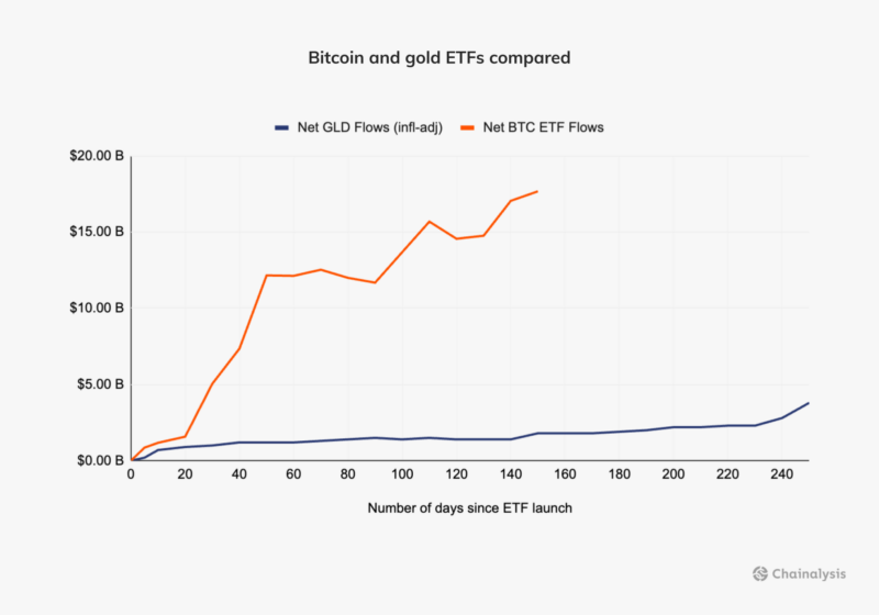 BTC ETF flows are also outpacing that of the first net gold ETF (inflation-adjusted) from its 2005 launch.