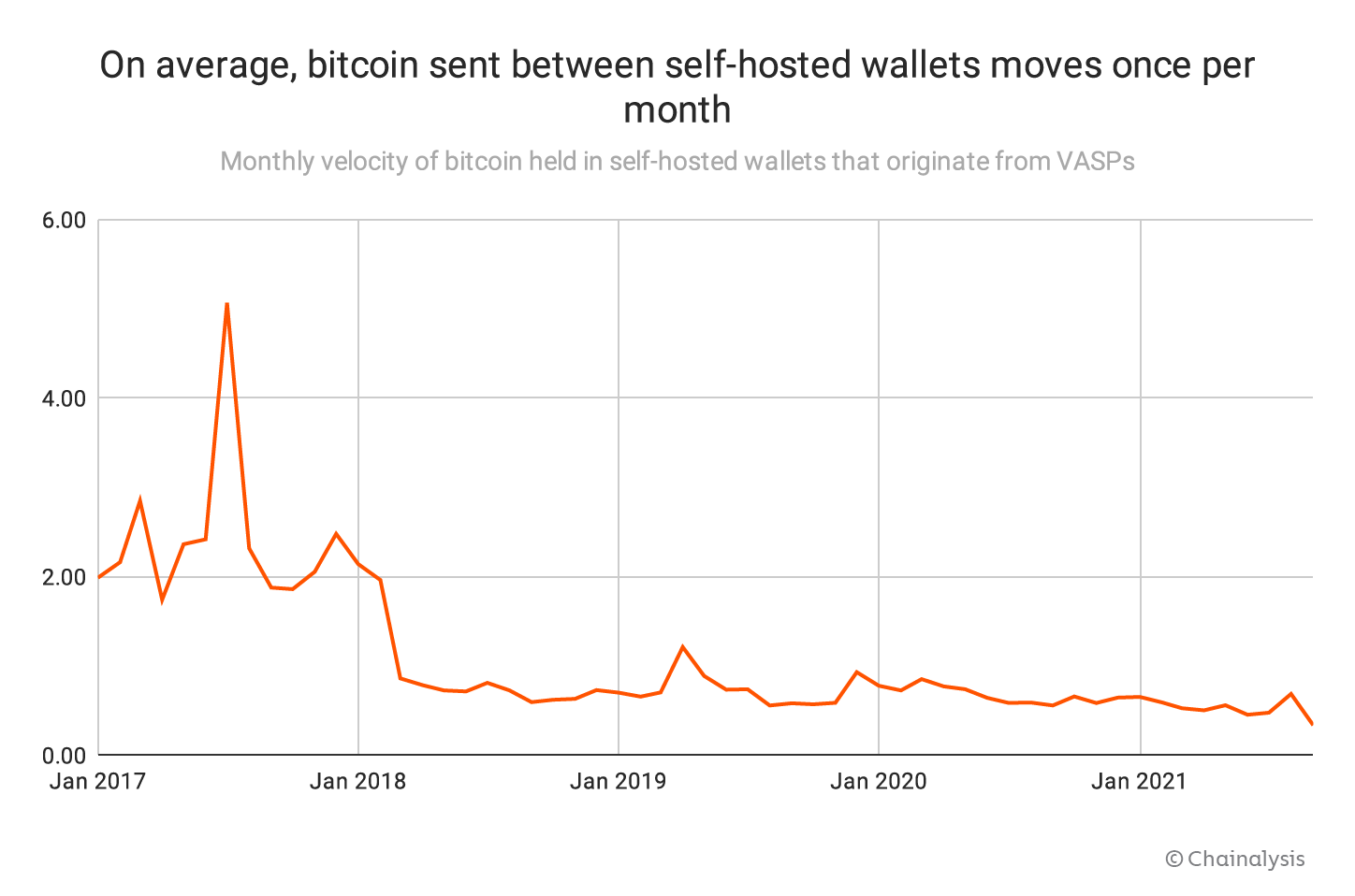 After funds are deposited to an unhosted wallet from an exchange, the percentage of bitcoin moved to another unhosted wallet in a given month is significantly low. The majority of the bitcoin stays in the original wallet for a long period of time. On average, the funds originated from a VASP to unhosted wallets move only once a month, which likely indicates that the primary use case is investment.