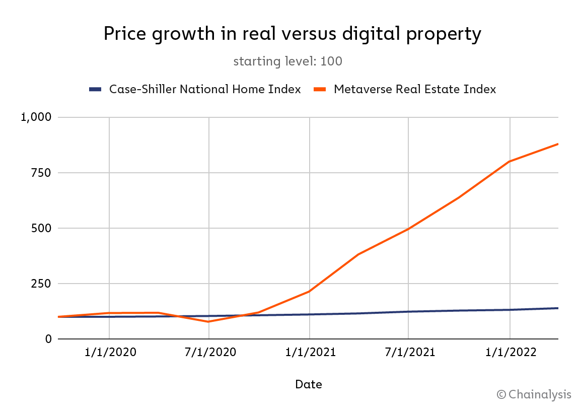 While this comparison is hardly apples-to-apples – the Case-Shiller index tracks physical single-family housing; the Metaverse index tracks digital parcels –  it’s nonetheless surprising. In the period studied, virtual real estate prices outpaced physical real estate by 532%. Why might that be?