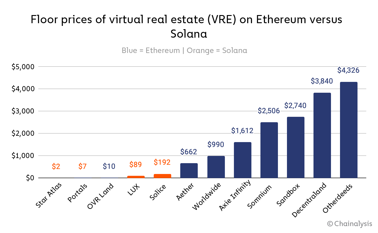 The biggest differences in virtual land prices seem to be between blockchains, not within them. Relative to virtual land on Ethereum, virtual land on Solana has much lower entry-level pricing.