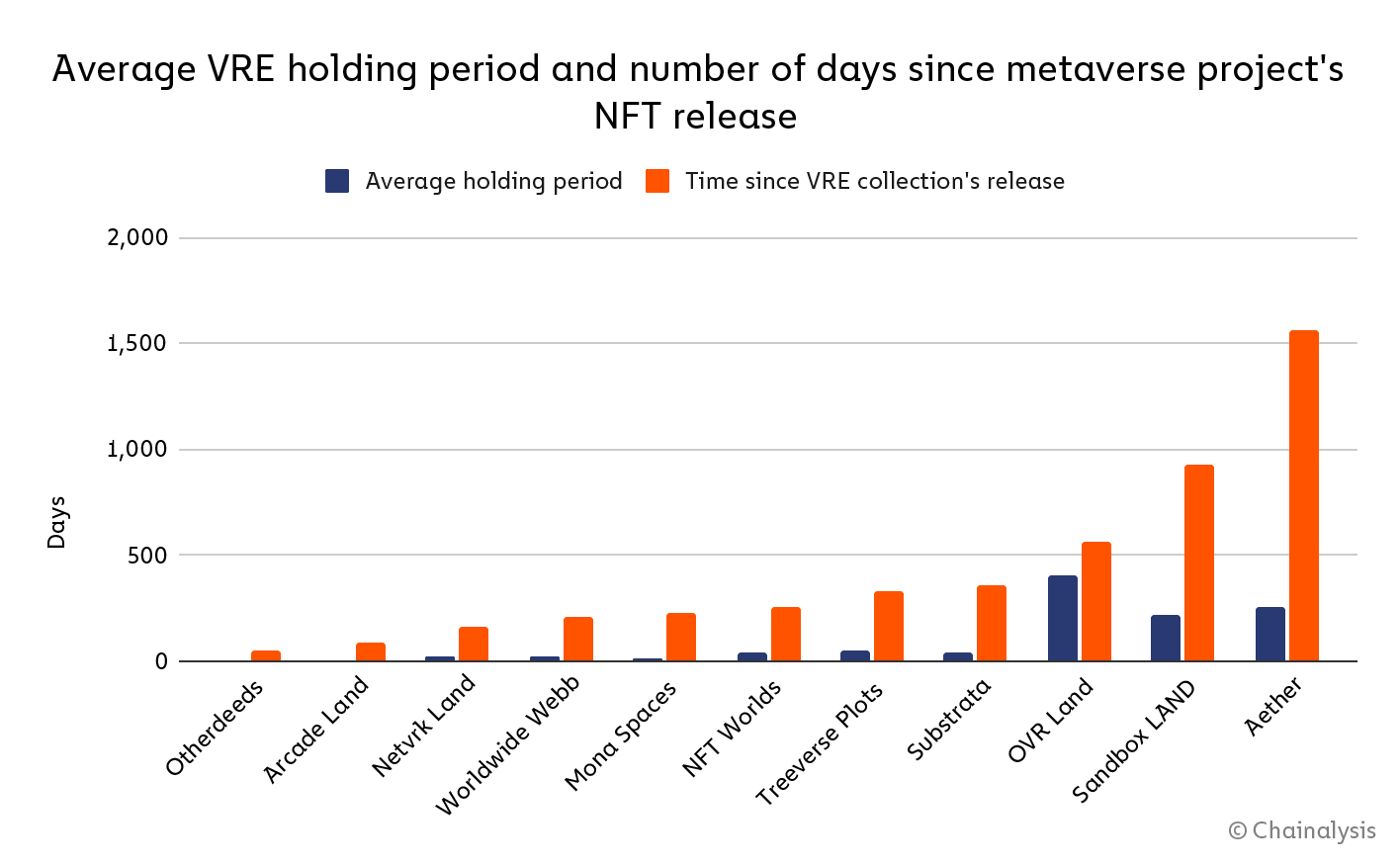 The biggest exception is OVR Land. OVR Land has the longest holders for three likely reasons: the land is abundant, cheap, and takes time to develop. There are more than 1.6 trillion OVR lands, each one costs just $10 to $50, and when you buy one, what you’re actually buying is the opportunity to overlay augmented reality (AR) experiences on top of real-world geography.