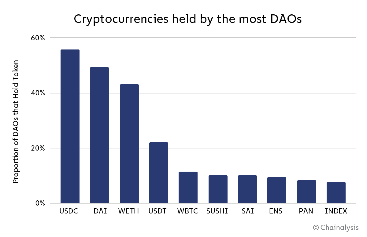 Even though DAOs vary in type and size, most of their on-chain treasuries hold similar cryptocurrencies. The most commonly held cryptocurrency is the stablecoin USD Coin (USDC), with over half of the 197 DAOs we analyzed holding a balance of USDC.