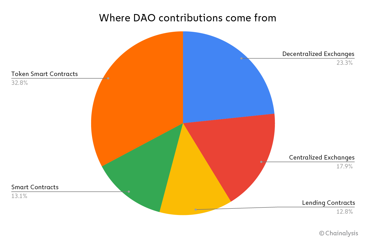 As one might expect, DAO participants are advanced users of cryptocurrency services. Only 17.9% of DAO treasury funds came from centralized services, while the remaining 82.1% originated at decentralized services. This suggests that most DAO contributors also engage with DeFi platforms and likely self-host their cryptocurrency.