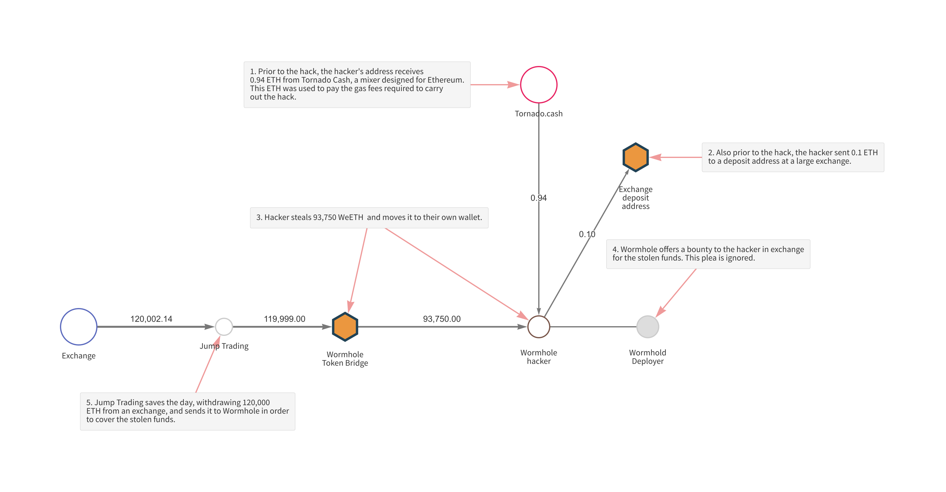 But luckily, the worst-case scenario didn’t happen. Jump Trading, Wormhole’s parent company and a major player in the Solana ecosystem, stepped up and supplied Ether to replace what was stolen, after attempts to pay the hacker a bounty in return for the stolen funds were ignored. We can see some of this on the Chainalysis Reactor graph below.
