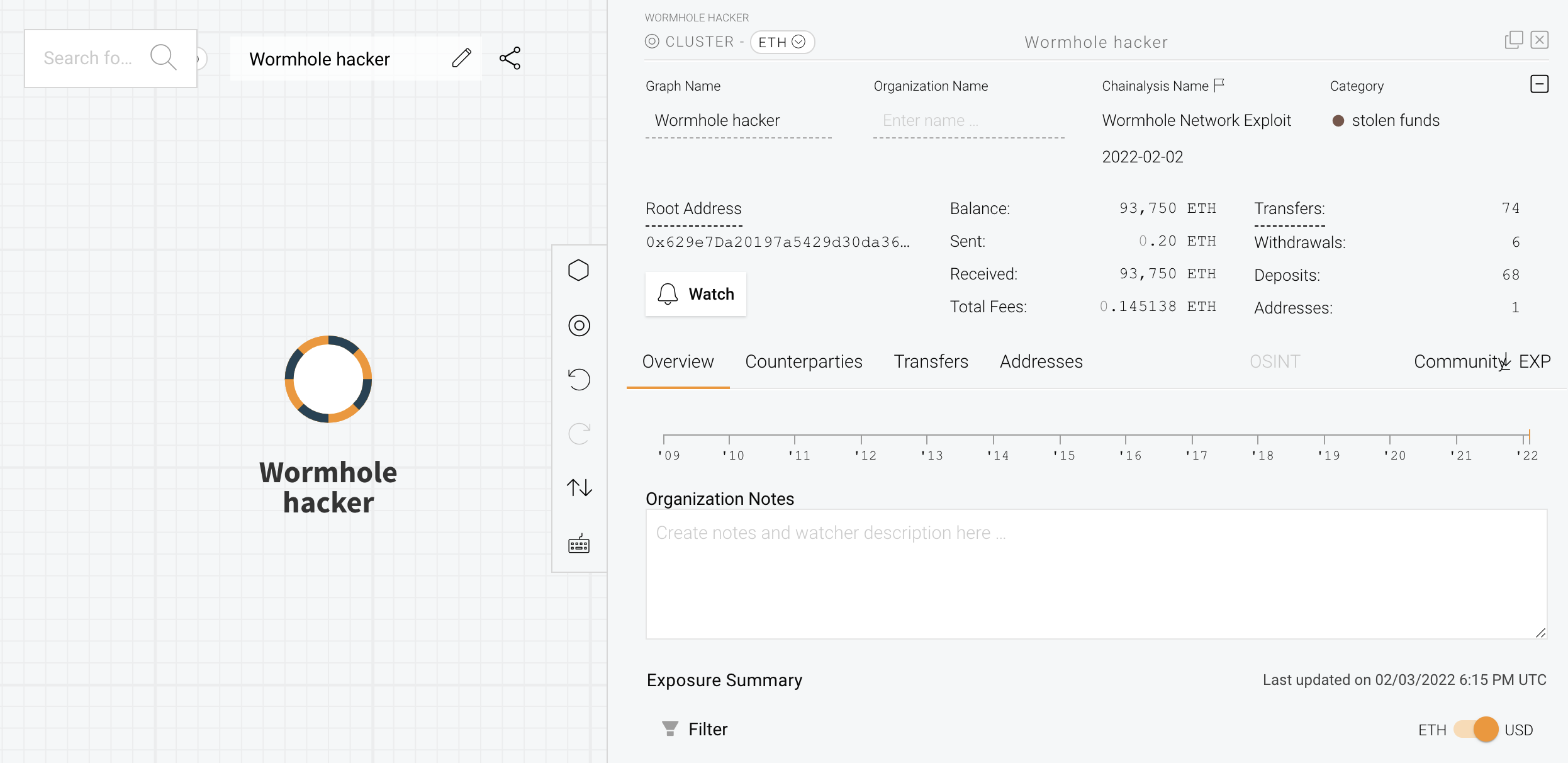As we see from the Reactor screenshot below, the Wormhole hacker still holds 93,750 ETH on the Ethereum blockchain, which was bridged back from the Solana blockchain following the hack. We can see this Ether in the balance of the address shown on the Reactor screenshot below.