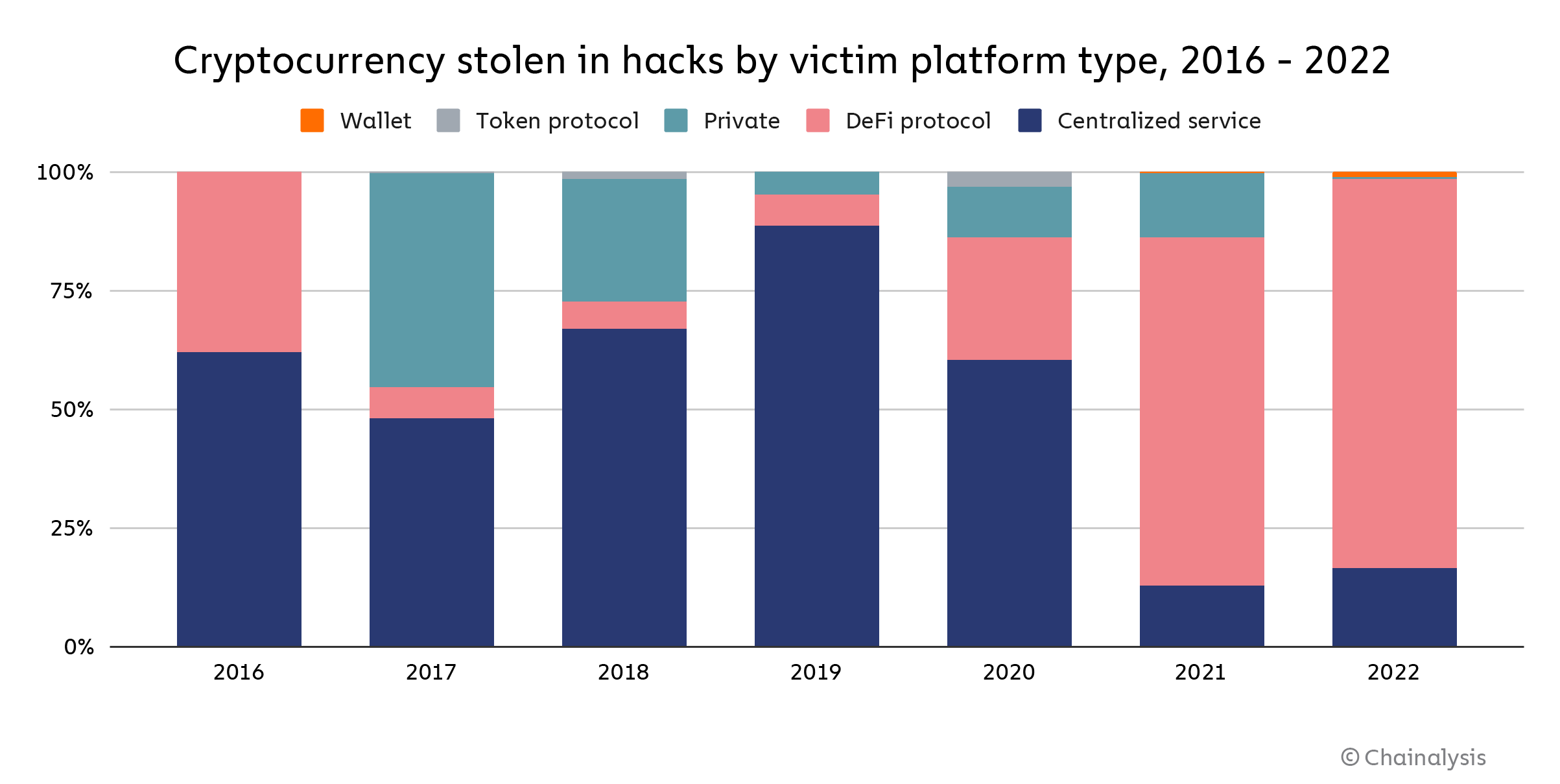2022 was the biggest year ever for crypto hacking, with $3.8 billion stolen from cryptocurrency businesses. In the 2021 Chainalysis Crypto Crime Report, we wrote about how DeFi protocols became the primary target of crypto hackers, and we saw that trend intensify in 2022.