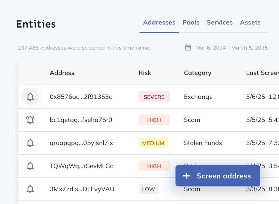 Address Screening empowers you with the insights needed to evaluate blockchain entities comprehensively, detect threats early, and ensure compliance with confidence.