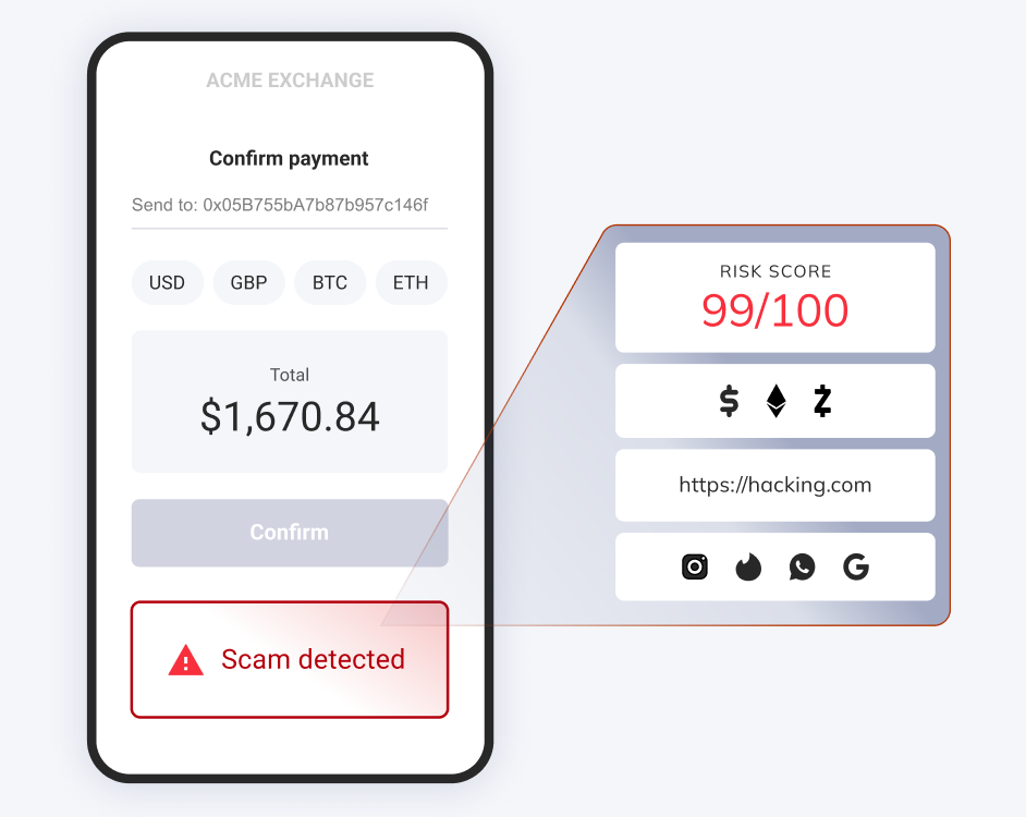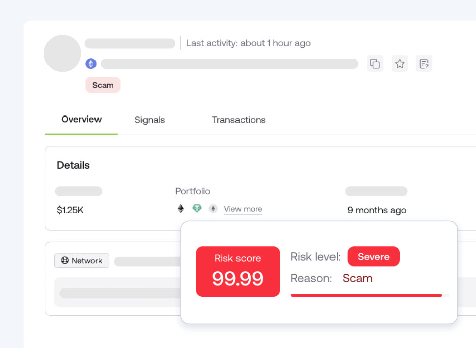 Detect and block fraudulent activity to scam-linked crypto wallets, high-risk counterparties, and suspicious on/off-ramp activity.