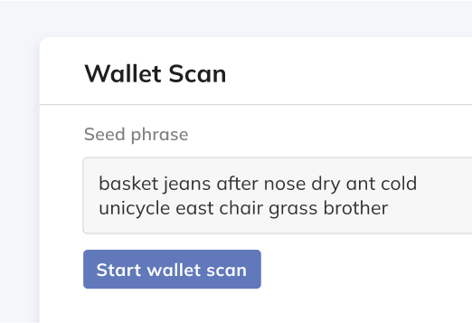 Check seed phrases for balances, historical activity, and links to illicit activities in seconds.