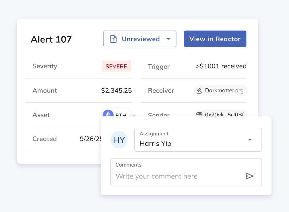 Customize risk settings, assign alerts for review and assess the transaction in KYT, and even perform deeper due diligence in Reactor.