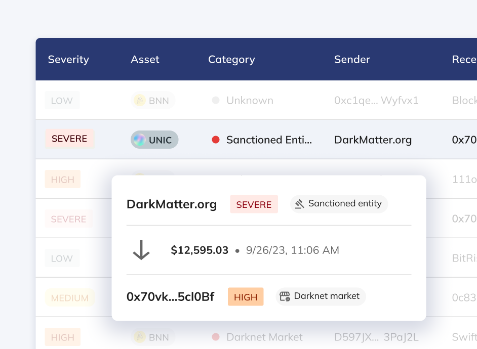 Identify and monitor risky market activity, such as transactions with sanctioned entities or high-risk addresses, enabling proactive measures like freezing or burning tokens to maintain the integrity of the ecosystem.