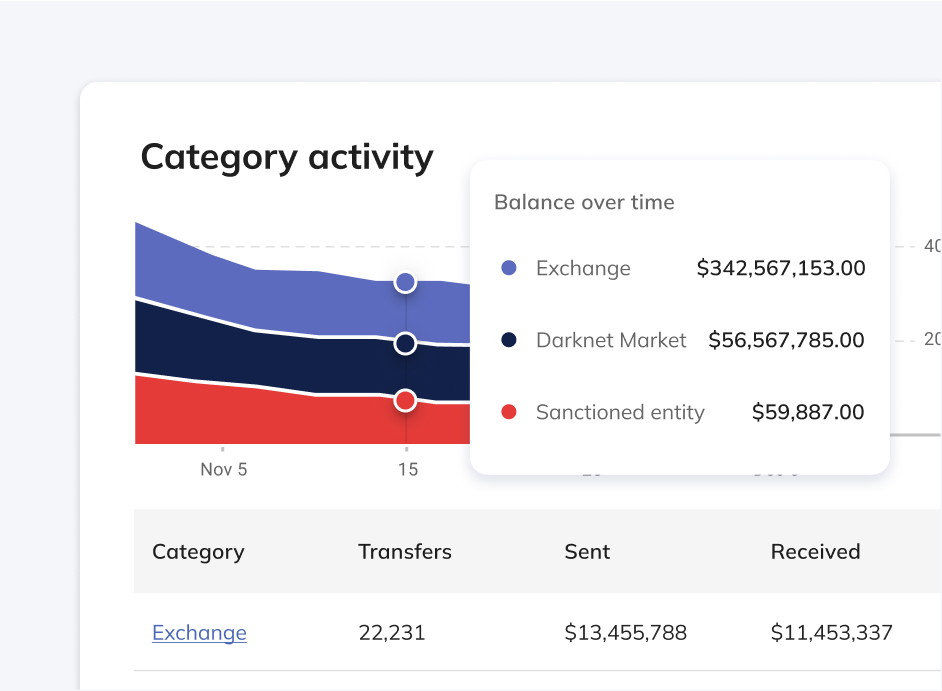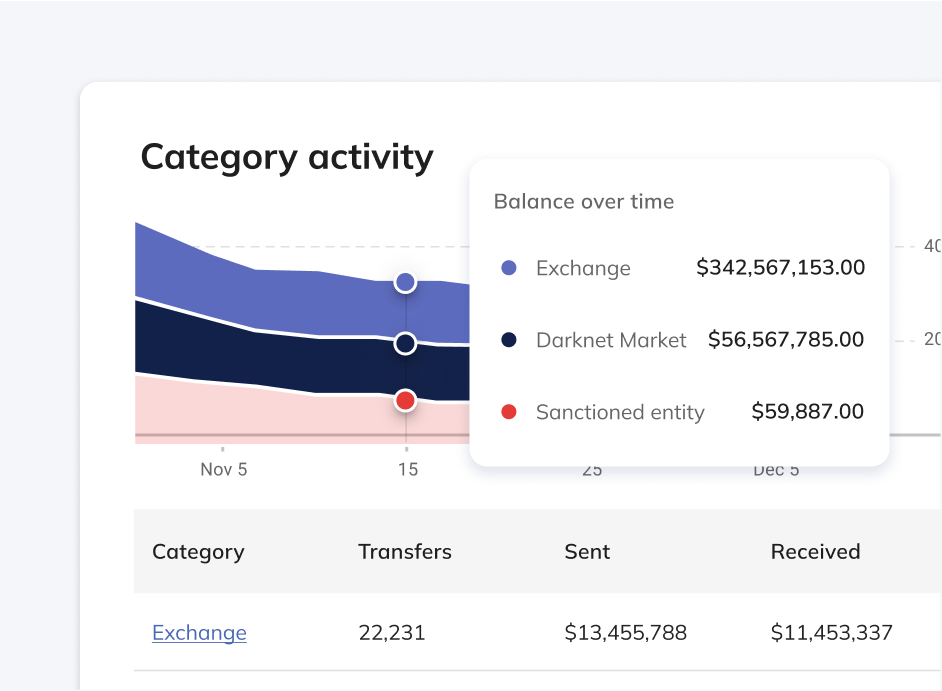 Gain a comprehensive view of your token’s ecosystem by analyzing risk exposure across more than 35 categories. Monitor daily transactions, identify and assess risk trends over time, and take proactive measures to ensure a safe and compliant environment.