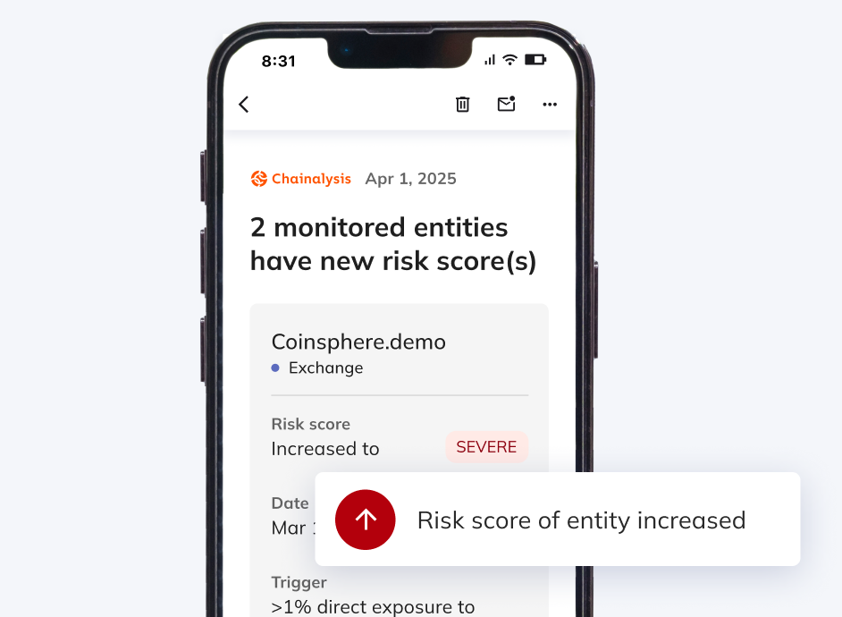 Eliminate the manual effort of periodic screening with continuous monitoring. Receive automatic notifications when a VASP’s risk score changes, making it easier to know when to investigate further.