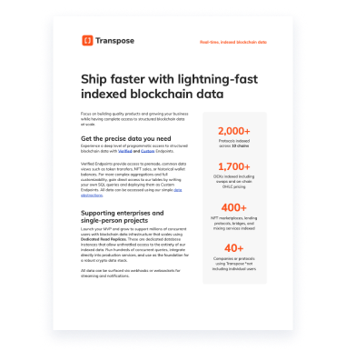 For standardized insights such as token transfers and NFT trades, use Transpose Verified API Endpoints. For more complex aggregations and full customizability, write your own SQL queries and deploy them as custom endpoints. For the most demanding production workloads, use Transpose Dedicated Read Replicas.